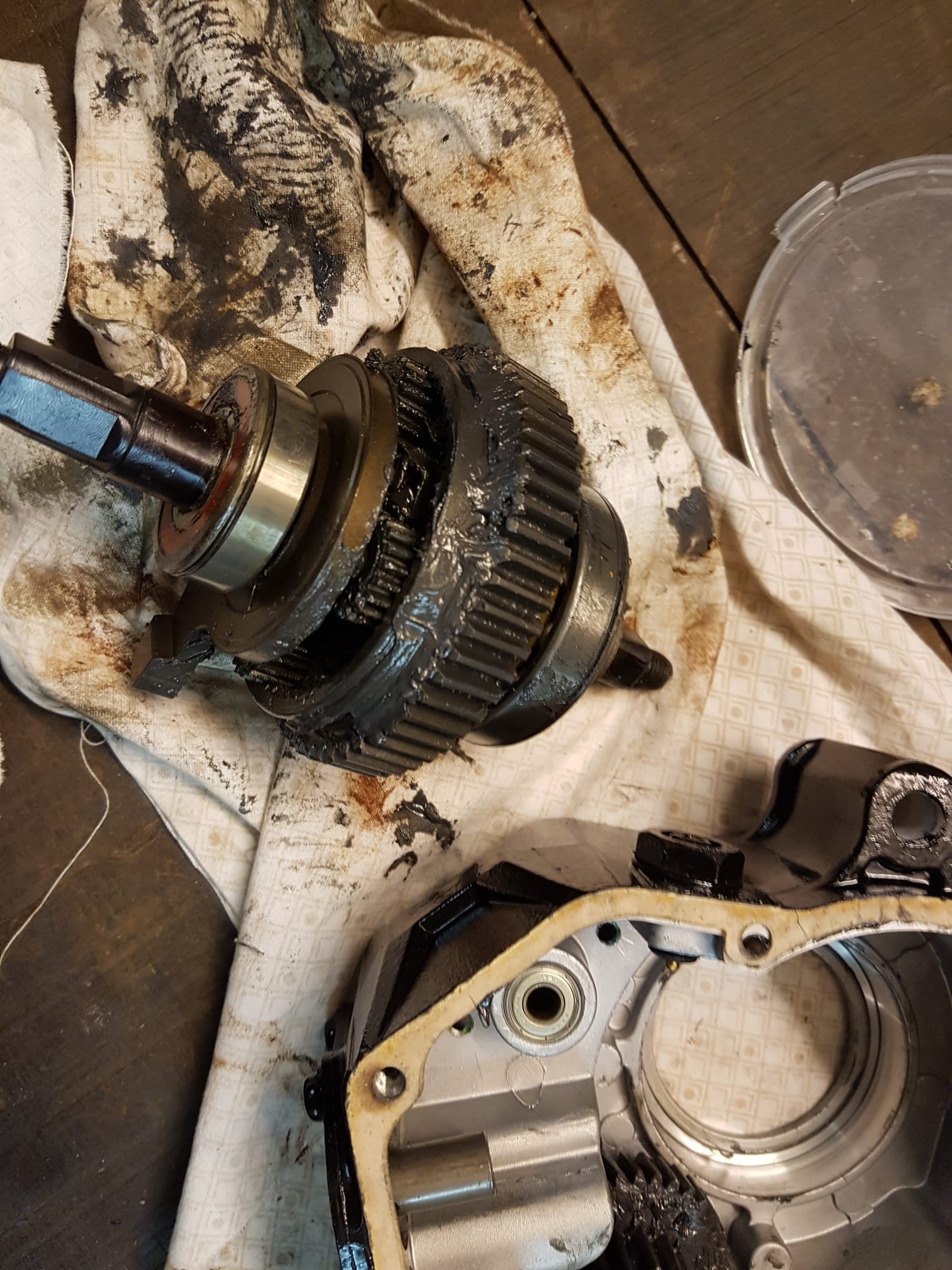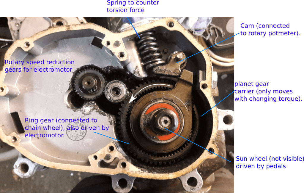 This mid-drive motor increases the rotary speed of the pedal axle to the chainwheel by using a planetary gearset. Doing that, it cleverly uses the planetary gear carrier in a semi-stationary way: it only rotates a few degrees due to torque applied on the pedals. This pushes a spring-loaded cam. The camshaft is directly coupled to a rotary potmeter, which is read out by the PCB. Very simple and elegant solution!